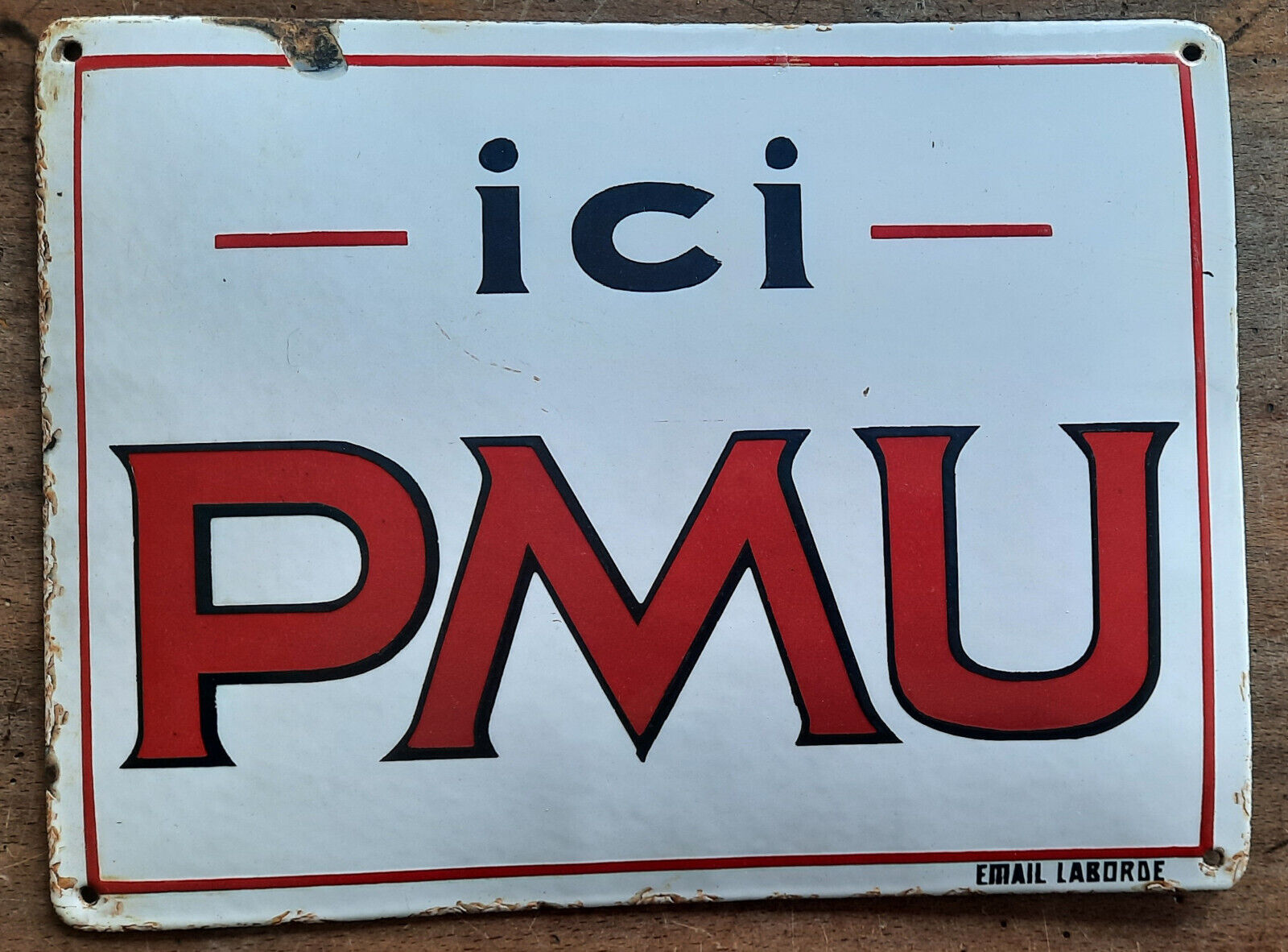 Ancienne plaque émaillée bombée ICI PMU émail LABORDE hippodrome chevaux 32x24cm