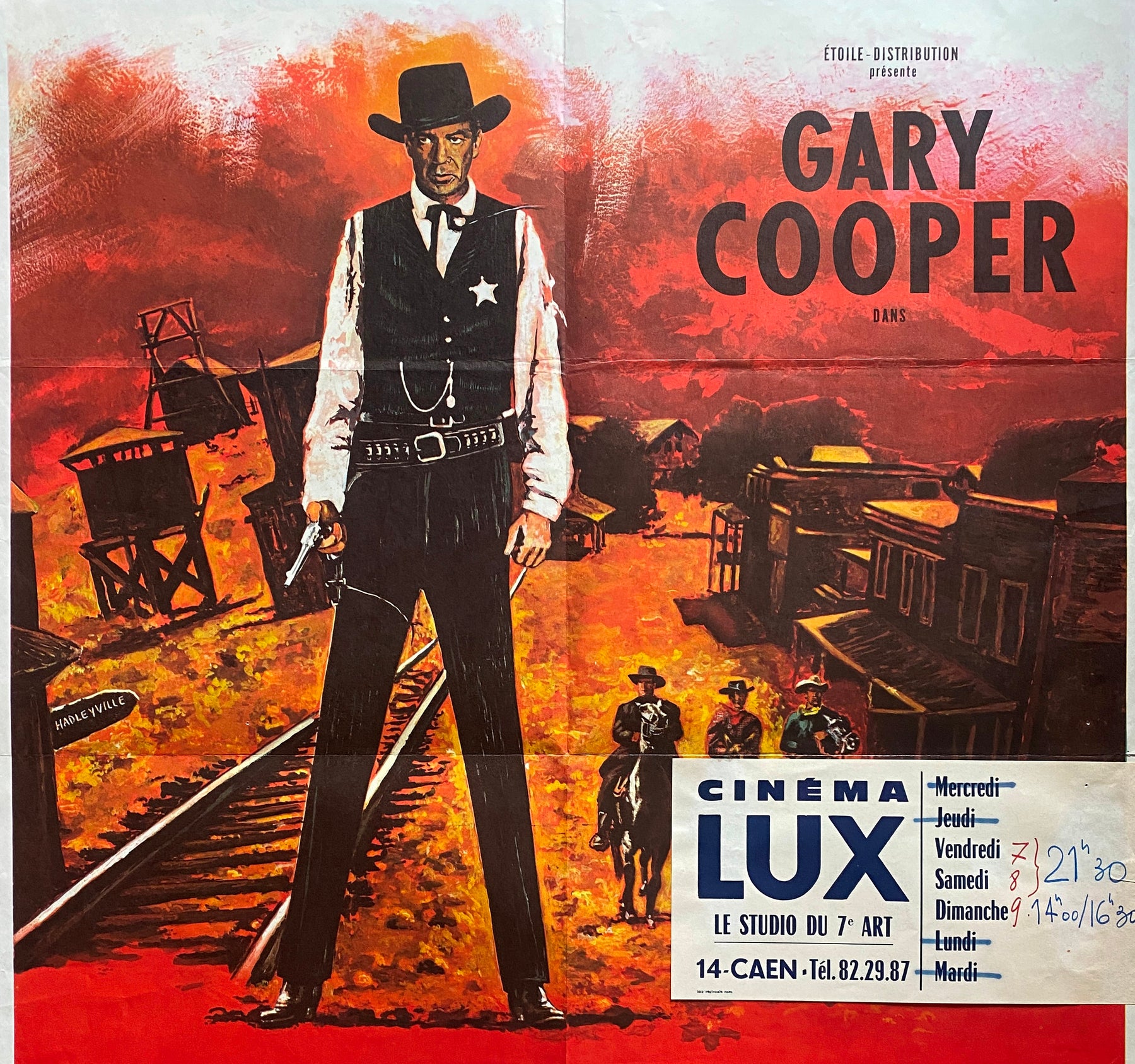 Pliée en bon état (quelques trous de punaises, une petite déchirure sur le bord dans le bas, un bandeau avec nom du cinéma)